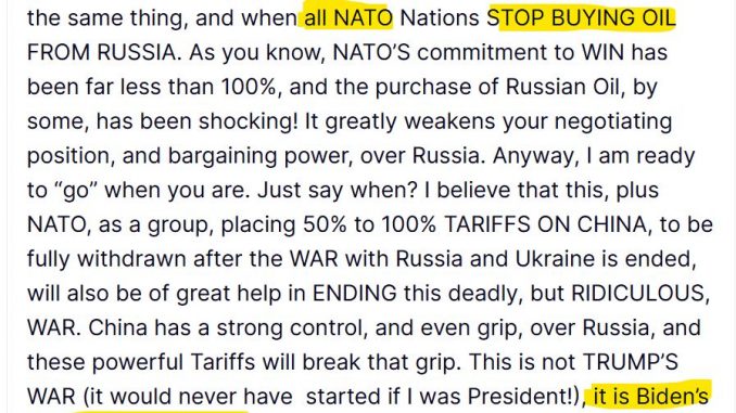 “„Готов съм да наложа големи санкции на Русия, когато всички нации от НАТО се съгласят и започнат да правят същото и когато ВСИЧКИ нации от НАТО ПРЕСТАНАТ ДА КУПУВАТ ПЕТРОЛ ОТ РУСИЯ.“
