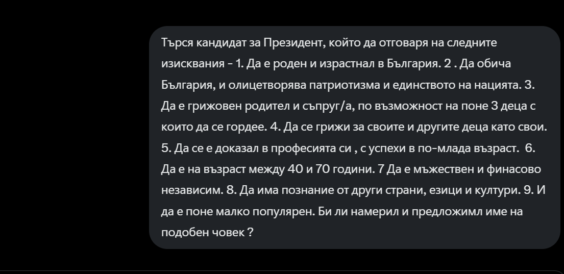“Търся кандидат за Президент, който да отговаря на следните изисквания – 1. Да е роден и израстнал в България. 2 . Да обича България, и олицетворява патриотизма и единството на нацията. 3. Да е грижовен родител и съпруг/а, по възможност на поне 3 деца с които да се гордее. 4. Да се грижи за своите и другите деца като свои. 5. Да се е доказал в професията си , с успехи в по-млада възраст. 6. Да е на възраст между 40 и 70 години. 7 Да е мъжествен и финасово независим. 8. Да има познание от други страни, езици и култури. 9. И да е поне малко популярен. Би ли намерил и предложимл име на подобен човек ?”
