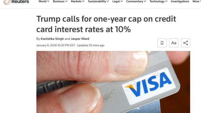 Тръмп твърди, че американците са „задавени“ от дългове, докато банките трупат „невиждани печалби на гърба на работещите хора“. През последните години големите американски издатели на кредитни карти (като JPMorgan Chase, Citigroup и Capital One) са начислили над 105 милиарда долара лихви годишно. Критиците от банковия лобизъм обаче предупреждават за апокалипсис: ако лихвите паднат под 10%, банките ще спрат да издават карти на хора с по-нисък кредитен рейтинг, ще премахнат програмите за бонус точки (cashback) и ще въведат нови, скрити такси.